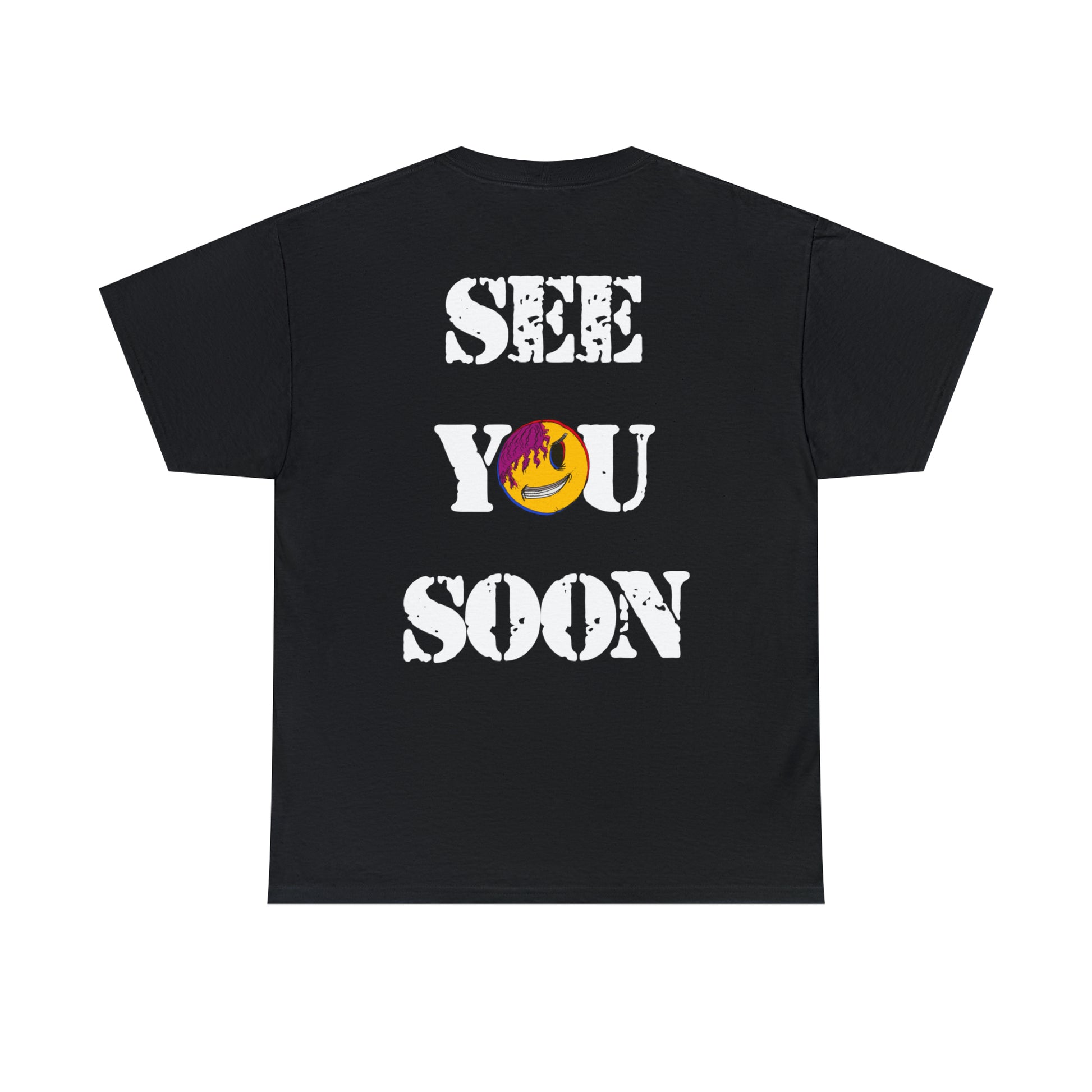 Evil Grin See You Soon T-shirt. A small image printed over the left side of the chest while the rear portion of the t-shirt is covered in large font overlayed with the same image. The t-shirt fibers provide a smooth surface to enjoy. No side seams mean there are no itchy interruptions under the arms.